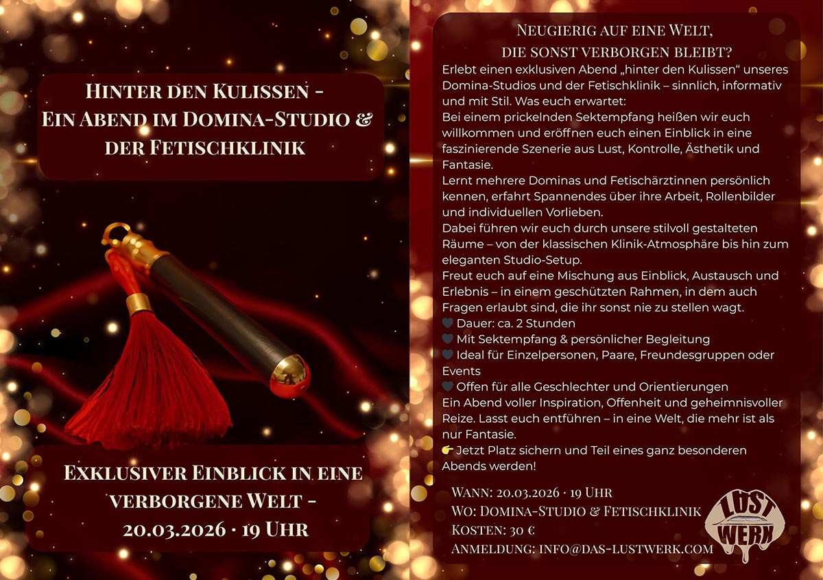 Erlebt einen exklusiven Abend „hinter den Kulissen“ unseres Domina-Studios und der Fetischklinik – sinnlich, informativ und mit Stil.